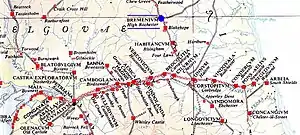 In 79 AD Agricola moved against the Brigantes of northern England and the Selgovae along the southern coast of Scotland, using overwhelming military power to establish Roman control.[1] He built a network of military roads and forts to secure the Roman occupation and Bremenium was built around 80 AD. Existing forts were strengthened and new ones planted in northeastern Scotland along the Highland Line, consolidating control of the glens that provided access to and from the Scottish Highlands. The line of military communication and supply across southeastern Scotland and northeastern England was Dere Street (on which Bremenium was located) which was well-fortified.