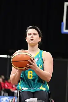 She made her national team debut in 2007 when she competed in the IWBF Qualification tournament.[5] She was selected to represent Australia at the 2009 Four Nations tournament in Canada, one of six players who played for the Dandenong Rangers in the WNWBL.[20] In July 2010, she played in a three-game test series against Germany.[21] In 2010, she was a member of the team that played in the Osaka Cup.[22] She represented Australia at the 2010 World Championships where her team finished fourth.[3]
