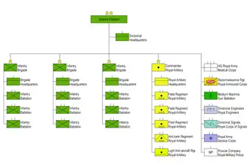 The infantry battalion consisted of the battalion Headquarters (HQ), HQ company (signals and administration platoons), four rifle companies (HQ and three rifle platoons), a support company with a carrier platoon, mortar platoon, anti tank platoon and pioneer platoon.[30] The rifle platoon had a HQ, which included a 2-inch mortar and an anti tank weapon team, and three rifle sections, each containing seven riflemen and a three-man Bren gun team.[31]