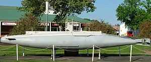 The submarines' hulls were tested to a nominal depth of 100 feet (30.5 m) by filling the hull with water and subjecting it to a pressure of 35 psi (241 kPa; 2 kgf/cm2), but the maximum operational depth was considered to be 50 feet (15.2 m). Nonetheless several boats safely dived to 95 feet (29.0 m) during World War I. It took about three minutes to dive the boat due to the shape of the boat and that it could dive out of control if water was pumped into the ballast tanks too quickly.[5] Submerged endurance was officially considered to be 10 hours, but several boats were submerged for 16 hours during the war.[4]