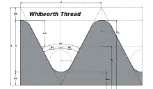 The Whitworth thread was the world's first national screw thread standard,[1] devised and specified by Joseph Whitworth in 1841. Until then, the only standardization was what little had been done by individual people and companies, with some companies' in-house standards spreading a bit within their industries. Whitworth's new standard specified a 55° thread angle and a thread depth of 0.640327p and a radius of 0.137329p, where p is the pitch. The thread pitch increases with diameter in steps specified on a chart.