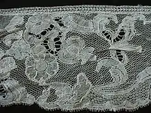 Brussels lace is a type of pillow lace that originated in and around Brussels.[1] The term "Brussels lace" has been broadly used for any lace from Brussels; however, strictly interpreted, the term refers to bobbin lace, in which the pattern is made first, and the ground, or réseau added, also using bobbin lace. Brussels lace is not to be confused with Brussels point (or Point de Gaze), which is a type of needle lace, though sometimes also called "Brussels lace".[2]