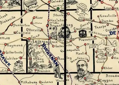This detail of Galbraith's 1897 Rail Service Map of Iowa shows Buchanan County towns of the time. It is a pictorial map rather than a technical map: Shady Grove, for example, is shown next to a man lying under a tree; Masonville is shown next to a Masonic symbol. Some of the towns' locations are slightly altered to make room for the illustrations. Several of these towns, including Hamerville, Vista, Kier, Middlefield, Newtonville, and Castleville no longer exist. A few are nearly ghost towns.