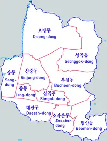 The three districts were abolished in July 2016 as Bucheon decided to become a unified city without any administrative districts.[5]