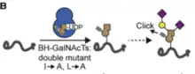 The N-Acetylgalactosaminyl transferase (GalNac Ts) family transfers N-Acetylgalactosamine to the Ser/Thr side chains (O-linked glycosylation) of its substrates, using UDP-GalNac as a cofactor. Like kinases, substrate profiling for specific isoforms of GalNac Ts has been difficult to achieve. The absence of a glycosylation consensus sequence and the variability of glycan elaboration pose a challenge to studying O-GalNac glycoproteins. Further, GalNac transferase knockout strategies are ineffective because the activity of isoforms in the family is both redundant and competitive, such that compensation occurs upon KO. Recently, Schumann et al. applied the bump-and-hole strategy to engineer bumped alkyne-containing UDP-GalNac analogs and double hole-modified I253A/L310A mutant GalNac Ts (BH GalNac Ts). The UDP-alkyne analogs were specific to complementary BH GalNac Ts, which were shown to maintain the biochemical competence of wild type GalNac Ts, with regards to structure, localization, and substrate specificity. This bump-and-hole pair attached a bio-orthogonal label, visualizable through click chemistry, on the substrates of distinct GalNac T isoforms, deconvolving substrate profiles while displaying complexity of glycan elaboration in the secretory pathway.[19]
