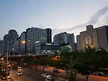 Two subway lines—the Bundang Line and Shinbundang Line—connect Bundang with the rest of the Seoul Capital Area. The Bundang line, first opened in 1994, connected Ori Station with Suseo Station, and numerous expansions have been made since, with the line now spanning from Wangsimni Station to Suwon Station.[6][7] Phase 1 of the Shinbundang Line was completed in October 2011, connecting Jeongja Station with Gangnam District, and Phase 2 opened in January 2016, expanding the line southward.[8] From Migeum Station, it takes 19 minutes to reach Gangnam station, and 17 minutes to reach Gwanggyo station.[9] Compared to bus travel, the subway reduces travel time by up to 25 minutes to Gangnam and up to 30 minutes to Gwanggyo.[10] The increase in accessibility to Seoul has caused the prices of apartments in Bundang to increase.[11] There are also a number of bus routes which service the communities in Bundang.[12] The Yongin–Seoul, Gyeongbu and Bundang-Suseo Urban Expressways connect Bundang with Seoul and nearby city centers.[13]