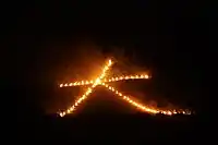 The Burning of the Character "Big" (大), also known as Daimonjiyaki (Japanese: 大文字焼き) or Daimonji Festival is the Japanese Buddhist ritual of burning wood in the character "Big" (大), typically in the mountain, on the last day of the 4-day Bon Festival to send back to the other world the spirits of the family ancestors that they welcomed on the first day.