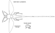It is difficult to distinguish different species of adult males within the genus Cystococcus. Adult male bodies are up to 9.5 mm long and they have an elongated abdomen which is likely an adaptation to enable mating through the gall entrance.[7] Males have purple wings that allow the transport of the immature female offspring out of the gall.[8] Each gall holds between 1700 and 4600 males.[2]