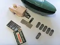 Greist often included a bonus in the form of a plastic pouch containing a set of the four additional templates — usually in grey plastic — not normally included with the buttonholer, viz sizes:- 3/8" (10mm) Straight, 1/2" (13mm) Straight, 15/16" (24mm) Straight, and a 5/8" (16mm) Keyhole. However, Greist continued to sell the Eyelet — made of metal alloy — individually, as well as selling templates in a Five-Pack of metal alloy inclusive of the eyelet; and in later years sold an Eight-Pack of templates — that included an Eyelet template — but only ever made of a black plastic fibre composite, or included them with the purchase of a Greist Buttonholer.