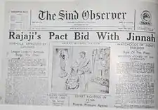 Chakravarti Rajagopalachari (or Rajaji as he was commonly referred to) was a prominent Congress leader from Madras. He was a well known follower of Gandhi and was sometimes referred to as Gandhi's conscience keeper.[23] Nonetheless, he proposed that if Muslims in India wanted a partition, Congress should not oppose this.[24] Thus he was the earliest Congress leader to acknowledge that partition was inevitable. He considered that, in the then likely scenario of Japanese invasion, India would need the support of the British and hence required the Congress and the League to agree on the constitution of India with urgency.[10] In April 1942, parts of the Madras Presidency were bombed by Japanese warplanes operating from the aircraft carrier Ryūjō. Arthur Hope, the Governor of Madras advised the people to leave Madras and also moved the secretariat inland.[25] Rajaji considered this an act of the British administration forsaking the people of Madras and brought resolutions in Madras Legislature Party of the All India Congress Committee that the Congress should concede the demand of Pakistan if the League insisted on it.[26] With severe opposition to the resolutions from the Congress leadership, he resigned from the Congress as per Gandhi's advice.[27] Thus he did not participate in the Quit India movement and was not arrested with the other Congress leaders.[24] Hence he was able to devise a proposal to negotiate with the League.[28] This proposal, which was called the CR formula by the popular press[29] was to recognise the demand for Pakistan in principle and to act as a basis for talks between the League and the Congress.[30]