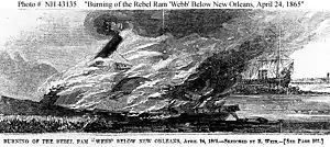 CSS Webb, a 655-ton side-wheel steam ram, was originally built in New York City in 1856 as the civilian steamship William H. Webb. She received a Confederate privateer's commission at New Orleans in May 1861, but was instead employed as a transport until January 1862. Converted to a "cotton clad" ram by the Confederate Army, thereafter served on the Mississippi and Red Rivers. On February 24, 1863, under the command of Captain Charles Pierce, she participated in the sinking of the Federal ironclad USS Indianola. Webb was transferred to the Confederate Navy in early 1865.[2][3] On April 23–24, 1865, under the command of Charles S. Read, Webb broke through the Federal blockade at the mouth of the Red River, Louisiana, and made a dramatic run down the Mississippi toward the Gulf of Mexico. After eluding several United States Navy vessels and passing New Orleans, she was confronted by the powerful steam sloop USS Richmond. Rather than face the veteran ship's broadside, the Webb was run ashore and destroyed by her crew.[4]