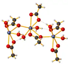 Fragment of the structure of cadmium diacetate dihydrate. Legend: red = O, black = C, blue = Cd.