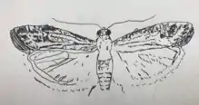 The adults of this moth species are about 1 cm long and have a brown grey complexion. Their wingspan ranges from 14–16 mm. A key element of distinction are its hindwings, which have short fringes. Reproductive structures also serve as an element of differentiation. This moth has an almost straight uncus and a long thin costal outgrowth and at almost 90° angle. Wing pattern does not serve as a differentiating element in this species as it is very similar to other species of its genus. Their body has six rows of purple-colored dots running horizontally and their head is a reddish-brown color.[2][3]