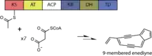 The core metabolic pathway for biosynthesis of this molecule resembles that of other characterized enediyne compounds and occurs via an iterative polyketide synthase (PKS) pathway. This type I PKS loads Acetyl-CoA and then repeatedly adds a total of seven Malonyl-CoAs. The growing polyketide is acted upon by the ketoreductase domain (KR) and dehydratase domain (DH) during each iteration to produce a 15-carbon polyene, which is then processed by accessory enzymes to yield the putative enediyne core of calicheamicin.[10][11][12] Maturation of the polyketide core is anticipated to occur by the action of additional enzymes to provide a calicheamicinone-like intermediate as a substrate for subsequent glycosylation.