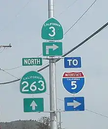 State Route 263 (SR 263) is a state highway in the U.S. state of California in Siskiyou County, running parallel to Interstate 5 to the west. Route 263 connects State Route 3 near the north city limits of Yreka to State Route 96 eight miles (13 km) north. Although SR 263 was once part of U.S. Route 99, it is not signed as part Business Loop 5.