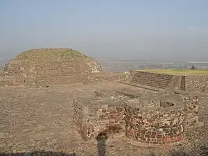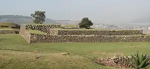 The Postclassic site extended approximately 264 hectares, covering portions of the valley floor, the majority of the Cerro Tenismo hill, and portions of a smaller hill to the east.[3] All of the major monumental architecture at the site was built during this period. Unlike many Postclassic Mesoamerican cities, which usually have a single central group of monumental architecture, the large structures at Calixtlahuaca are split into multiple smaller architectural groups scattered from the valley floor to the summit of the hill. The areas between the monumental groups were filled in with a mixture of commoner houses and agricultural terraces.[3]