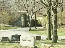 Within just a few years, the cemetery featured a stone receiving vault, waiting room at the entrance, and a number of roads.[7] A streetcar spur ran adjacent to the cemetery, allowing caskets and funeral parties to reach the cemetery by electric train.[4] The 746-foot (227 m) long spur was removed in 1927.[10]