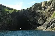 A huge natural arch transverses the northern half of the island from south west to north east and there is a large sea cave to the south.[1] The islet of Cùl Champaigh lies offshore to the north, and tiny Sgeir Dearg (red skerry) and the larger Màs Sgeir (seagull skerry) beyond.[2]