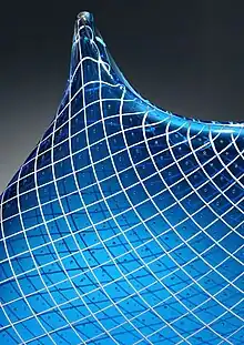 The classical reticello pattern is a small uniform mesh of white threads in clear glass, with a tiny air bubble in every mesh rectangle. To make an object in this pattern, the glassblower first uses white single-thread vetro a fili canes to blow a cylindrical cup shape, twisting as he forms it so the canes are in a spiral, and using care not to totally smooth the inside ribbing that remains from the canes. Setting this cup aside (usually keeping it warm in a furnace, below its softening point), he then makes another closed cylinder in the same pattern, but twisted in the opposite direction, and retaining some of the ribbing on the cylinder's outside. When this cylinder is the right size, the glassblower plunges it into the warm cup, without touching any of the sides until it is inserted all the way. Air is trapped in the spaces between the ribs of the two pieces, forming the uniformly spaced air bubbles. The piece may then be blown out and shaped as desired.[6]:240 The term reticello is often loosely applied to any criss-cross pattern, whether vetro a fili or vetro a retorti , white or colored, and with or without air bubbles.