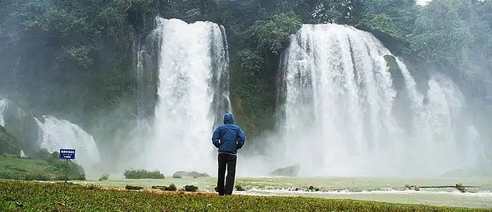 Bản Giốc Waterfalls are located 80 kilometres (50 mi) north of Cao Bằng at the Vietnam-China Border. It originates from the Quỳ Xuân River and falls over a height of 30 metres (98 ft) and is 300 metres (980 ft) wide. At the top, the waterfall is seen in three parts divided by rocks and trees. As the water falls down the cliff and merges with sunlight, a seven-coloured rainbow formation is witnessed. Many green trees and flowers that perfume the air are located at the base of the fall.[22]