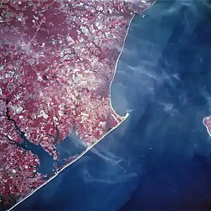 Cape Henlopen is the southern cape of the Delaware Bay along the Atlantic coast of the United States. It lies in the state of Delaware, near the town of Lewes, where the Delaware Bay meets the Atlantic Ocean. Off the coast on the bay side are two lighthouses, called the Harbor of Refuge Light and the Delaware Breakwater East End Light.