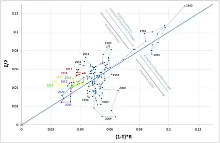 The CSS equilibrium condition suggests that the Fed model might be misspecified: the S&P 500 earnings yield during 1987 to 2000 was not in equilibrium with the government bond yield but with the average after-tax interest rate on corporate bonds. The CSS theory suggests that the Fed equilibrium was only observable after 1982, the year in which the United States Securities and Exchange Commission allowed open-market repurchases of shares.[7] However, the CSS theory cannot explain why the Fed model relationship breaks down for all other periods, such as 2000 to 2019.