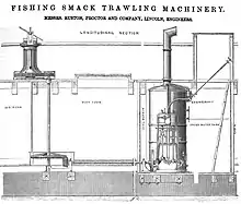 Capstan winches were also important on sailing trawlers (e.g. Brixham trawlers) as a means for fetching in the nets after the trawl. When they became available, steam powered capstan winches offered a great saving in effort. These used a compact combined steam engine and boiler below decks that drove the winch from below via a shaft. Ruston, Proctor and Company at the UK 1883 Fisheries Exhibition marketed an engine, boiler, shafts and capstan designed specifically for this task.[4]
