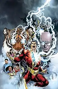One of these relaunched series, Justice League (vol. 2), began featuring a Shazam! backup story with issue #7 in March 2012.[63] The feature, written by Geoff Johns and drawn by Gary Frank, introduces Billy Batson and his supporting cast into the new DC Universe. As part of the redesign, Captain Marvel received a new costume designed by Frank with a long cloak and hood, and a metallic belt instead of a sash. His lightning bolt appears as an opening into his body with magical energy visibly inside of him.[64] Johns noted that the character's place in the world will be "far more rooted in fantasy and magic than it ever was before".[65] The character also was officially renamed "Shazam" at this time.[7] The Shazam! origin story, which included two full issues in Justice League (vol. 2) #0 (2012) and 21 (2013), reintroduced Billy Batson/Shazam, the Wizard, Black Adam, Tawny the tiger, and the Shazam Family (Freddy, Mary, Darla, Eugene, and Pedro) to continuity. The Shazam! feature concluded with Justice League (vol. 2) #21, preceding DC's crossover storyline "Trinity War" which heavily features the Shazam mythos.