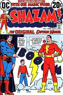 ![]() Cover of Shazam! #1 (Feb. 1973), the first key appearance of Captain Marvel in a DC publication, and his first in 20 years following the cancellation of the Fawcett Comics line. Art by C. C. Beck with Nick Cardy and Murphy Anderson | |