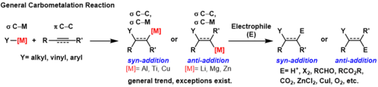 A carbometallation is any reaction where a carbon-metal bond reacts with a carbon-carbon π-bond to produce a new carbon-carbon σ-bond and a carbon-metal σ-bond.[1] The resulting carbon-metal bond can undergo further carbometallation reactions (oligomerization or polymerization see Ziegler-Natta polymerization) or it can be reacted with a variety of electrophiles including halogenating reagents, carbonyls, oxygen, and inorganic salts to produce different organometallic reagents. Carbometallations can be performed on alkynes and alkenes to form products with high geometric purity or enantioselectivity, respectively. Some metals prefer to give the anti-addition product with high selectivity and some yield the syn-addition product. The outcome of syn and anti- addition products is determined by the mechanism of the carbometallation.