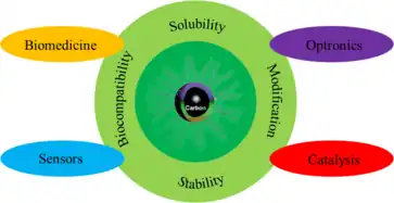 - 1 2 3 4 5 6 7 8 Lim, Shi Ying; Shen, Wei; Gao, Zhiqiang (2015). "Carbon quantum dots and their applications". Chemical Society Reviews. 44 (1): 362–81. doi:10.1039/C4CS00269E. PMID 25316556.