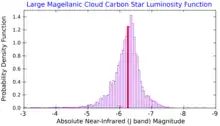 A histogram showing the relative number of LMC carbon stars with a given near-infrared luminosity. The median value is marked in red. Adapted from Ripoche et al. (2020)[14]