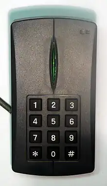 A card reader is a data input device that reads data from a card-shaped storage medium. The first were punched card readers, which read the paper or cardboard punched cards that were used during the first several decades of the computer industry to store information and programs for computer systems. Modern card readers are electronic devices that can read plastic cards embedded with either a barcode, magnetic strip, computer chip or another storage medium.