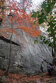 The rock cliffs are made of Wissahikon Mica-schist and range from 25 to 60 feet (7.6 to 18.3 meters), with the majority of the climbs about 35 feet (11 m).[2] They pack over 100 established climbs within approximately 200 yards (180 m) of the cliff.[5] The rock has form of friction slabs, overhangs, and cracks. Most of the routes are easy and moderate top-rope routes, with a few harder climbs as well as numerous eliminate routes and boulder problems. Traditional climbing is not recommended since protection is often difficult to place and the schist has a reputation for being friable and breakable if a piece of gear is subjected to a leader fall.[3] The area known for its esoteric bouldering, often very different in character from other bouldering areas and relying heavily on delicate footwork between quartz crystal knobs and nubbins imbedded in polished schist wall.