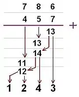 - The ten is copied from the next digit left, and then 'paid back' by adding it to the subtrahend in the column from which it was 'borrowed', giving in this example 4 − (1 + 1) in the tens column.