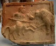 The penetrating power of the cataphract's lance was recognized as being fearful by Roman writers, described as being capable of transfixing two men at once, as well as inflicting deep and mortal wounds even on opposing cavalries' mounts, and were definitely more potent than the regular one-handed spear used by most other cavalries of the period. Accounts of later period Middle Eastern cavalrymen wielding them told of occasions when it was capable of bursting through two layers of chain mail.[31] There are also reliefs in Iran at Firuzabad showing Persian kings doing battle in a fashion not dissimilar to later depictions of jousts and mounted combat from the Medieval era.[32]