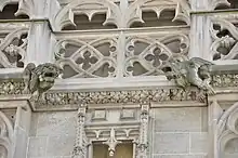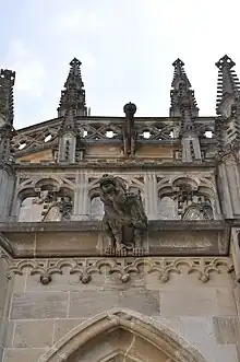 During this time, the late-Gothic St Joseph's Chapel was completely removed. A neo-Gothic flèche was also added. Steindl's plan was to rebuild all the neo-Gothic components of the cathedral, but this was denied by the commission who instead requested that old stone constructions be replaced with new ones. Rebuilding the towers in the Gothic style was not realized largely due to a lack of funds, which was also reflected in the use of cheaper construction material. For structural repairs between 1878 and 1882, cheap but low-quality sandstone from the nearby Spiššké Vlachy stone pit was used.[15] This stone quickly degraded and resulted in the removal of pinnacles and gargoyles from the outer surface because they endangered pedestrians. In the next phase of reconstruction beginning in 1882, higher quality sandstone from Banská Bystrica was used.[14]