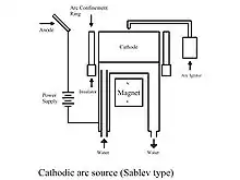 A Sablev type Cathodic arc source, which is the most widely used in the West, consists of a short cylindrically shaped, electrically conductive target at the cathode with one open end. This target has an electrically-floating metal ring surrounding it, working as an arc confinement ring (Strel'nitskij shield). The anode for the system can be either the vacuum chamber wall or a discrete anode. Arc spots are generated by a mechanical trigger (or igniter) striking on the open end of the target making a temporary short circuit between the cathode and anode. After the arc spots are generated they can be steered by a magnetic field, or move randomly in absence of magnetic field.
