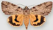 The wingspan is 70–85 mm; C. n. euphemia is distinctly larger (around 90 mm). The forewings are brownish gray above, evenly dark from base to tip or with the center somewhat darker, and varying geographically between somewhat paler and browner in the aridland population and darker gray marked with brown in the eastern individuals (see Gloger's rule). The hindwings are conspicuously colored in various hues of orange with roughly concentric black markings above. Their basal area carries a dense covering of thin dark hairs which stretches along the dorsum, making this area appear more brownish or reddish. Through the hindwing center runs a black band from the leading almost to the trailing edge; a similar but wider band runs close to and parallel with the termen from apex to tornus. The border of the black bands with the fairly narrow area of orange between them is not even, but has some deep and irregular scallops. The outer rim of the hindwing is lighter yellow than the rest; along the wing veins the outer black band extends to the termen as faint blackish stripes. The undersides are pale yellowish orange with black bands. As is typical for the hickory/walnut-feeding Catocala of North America, both foreleg and hindleg tibiae of this species are spiny, and the tarsi carry four rows of irregular rows of spines each.[2]