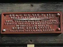 The Cavell Van was designed by Richard Maunsell.[2] It was built to Diagram 960 by the South Eastern and Chatham Railway at Ashford Works in 1919 and was the prototype Parcels and Miscellaneous Van.[3] In 1919, it was used for the carriage of the bodies of two people killed during the First World WarEdith Cavell and Charles Fryatt. It carried the body of The Unknown Warrior in 1920.[4]