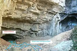 - Westminster - The entrance, covered with a wooden door, was described as being in an old quarry, facing east. The cave consisted of a single room, though reportedly extending to the west through rockfall. A concrete floor was in the entrance room and was previously used as a milk cooler. It is developed in the Wakefield marble.[3]
