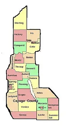 Cayuga County is a county in the U.S. state of New York. As of the 2020 census, the population was 76,248.[2] Its county seat and largest city is Auburn.[3] The county was named for the Cayuga people, one of the Native American tribes in the Iroquois Confederation.