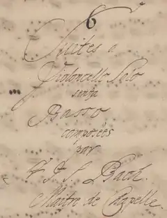 - ↑ "Pars 1. | Violino Solo | Composée | par | Sr. Jean Seb: Bach. | Pars 2. | Violoncello Solo. | Senza Basso. | composée | par | Sr. J. S. Bach. | Maitre de la Chapelle | et | Directeur de la Musique | a | Leipsic. | ecrite par Madame | Bachen. Son Epouse."