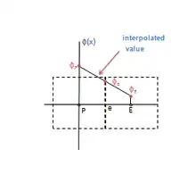 In applied mathematics, the central differencing scheme is a finite difference method that optimizes the approximation for the differential operator in the central node of the considered patch and provides numerical solutions to differential equations.[1] It is one of the schemes used to solve the integrated convection–diffusion equation and to calculate the transported property Φ at the e and w faces, where e and w are short for east and west (compass directions being customarily used to indicate directions on computational grids). The method's advantages are that it is easy to understand and implement, at least for simple material relations; and that its convergence rate is faster than some other finite differencing methods, such as forward and backward differencing. The right side of the convection-diffusion equation, which basically highlights the diffusion terms, can be represented using central difference approximation. To simplify the solution and analysis, linear interpolation can be used logically to compute the cell face values for the left side of this equation, which is nothing but the convective terms. Therefore, cell face values of property for a uniform grid can be written as:[2]