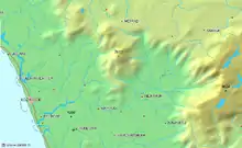 The Chaliyar originates in the Western Ghats range at Ilambaleri hills in the ranges of Nilgiri Mountains of Western Ghats,[5] which is also near Wayanad-Malappuram district border. Chaliyar flows through Malappuram District for most of its length and then for around 17 km it forms the boundary between Malappuram District and Kozhikode District before entering the city of Kozhikode for its final 10 km journey and finally empties into the Lakshadweep Sea at Beypore. Six major streams Chaliyarpuzha, Punnapuzha, Kanjirapuzha, Karimpuzha, Iruvahnipuzha and Thottumukkampuzha constitute the Chaliyar River drainage system. Other important tributaries are Kurumanpuzha, Pandipuzha, Maradipuzha, Kuthirapuzha and Karakkodupuzha. Most of these rivers have their origin in the Nilgiri hills in the east and Wayanad hills in the north, where they form a number of rapids and waterfalls.[5] Near the origin of river are the Meenmutty Falls at coordinates 11°31′40″N 76°14′12″E / 11.527755°N 76.236534°E by Vaduvanchal, Wayanad
