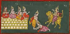 The siblings Muktabai, Sopan, Dnyaneshwar and Nivruttinath seated on the moving wall, Changdev seated on a tiger. In the centre, Changdev bows to Dnyaneshwar