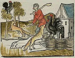 Because the tale of Chanticleer and the Fox enters into several mediaeval narrative masterworks, there has been considerable investigation into the question of its origin.[2] It has also been asserted that the tale has developed out of the basic situation in Aesop's fable of The Fox and the Crow.[3] Early examples of the story are pithily fabular but towards the middle of the 12th century it appears as an extended episode of the Reynard cycle under the title "How Renart captured Chanticleer the cock" (Si comme Renart prist Chanticler le Coq). The work of which it was part was immensely popular and spread widely in translation.