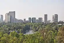 Chapultepec Park is the second largest city park in Latin America, after the Santiago Metropolitan Park in Chile, measuring in total just over 686 hectares (1,700 acres).[1][10][15] It is classed as one of the world's largest and most visited urban parks, along with Bois de Boulogne in Paris, the Imperial Gardens in Tokyo, and Central Park in New York City.[2] The name "Chapultepec" means "at the grasshopper hill" in Nahuatl and refers to a large rock formation that is the center of the park's first section. Originally, this area was a forest outside of Tenochtitlan, once considered sacred in pre-Columbian times, but today it is entirely within the city (mostly in the borough of Miguel Hidalgo), surrounded by some of its primary business and commercial districts.[1][2][18] The park is divided into three sections, the first and oldest surrounded by fencing and closed at night, with the other two left open. It contains nine museums, amusement parks, winding paths, commemorative sculptures, lakes and fountains.[1][2] Paseo de la Reforma passes most of the park and cuts through a portion on the north side.[2]