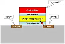 Electrons are moved onto the charge trapping layer similarly to the way that floating gate NOR flash is programmed, through channel hot electron (CHE) injection mechanism also known as Hot-carrier injection. In brief, a high voltage is placed between the control gate while a medium-high voltage is applied on the source and the drain while a current is induced from the source to the drain. Those electrons that have gained sufficient energy in traversing through the high-field region near the drain will boil off from the channel to be injected into the charge trapping layer where they come to rest.