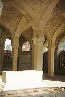 Chausath Khamba, also spelled Chaunsath Khamba, is a tomb built during 162324. It is located in Nizamuddin precincts of Sufi Muslim shrines and tombs in New Delhi, India. The name means "64 pillars" in Urdu and Hindi. It was built by Mirza Aziz Koka, son of Ataga Khan, as a mausoleum for himself, at the time when Mughal Emperor Jahangir ruled from Delhi. Mirza Aziz Koka had served several times as Jahangir’s Governor of Gujarat before he died in Gujarat.[1][2][3]